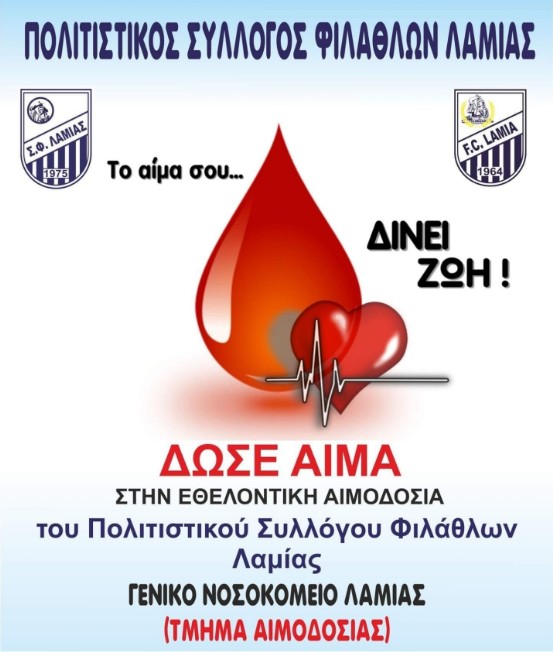 Συγκεκριμένα, το προσεχές Σάββατο, 11 Οκτωβρίου ο Σύλλογος Φιλάθλων Λαμίας θα διοργανώσει αιμοδοσία στο Γενικό Νοσοκομείο .