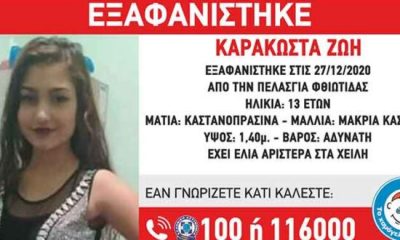 Εξαφανίστηκε από το σπίτι της στην Πελασγία Φθιώτιδας, η 13χρονη Ζωή Καρακώστα. Η ενημέρωση από το Χαμόγελο του Παιδιού όπως αναρτήθηκε...